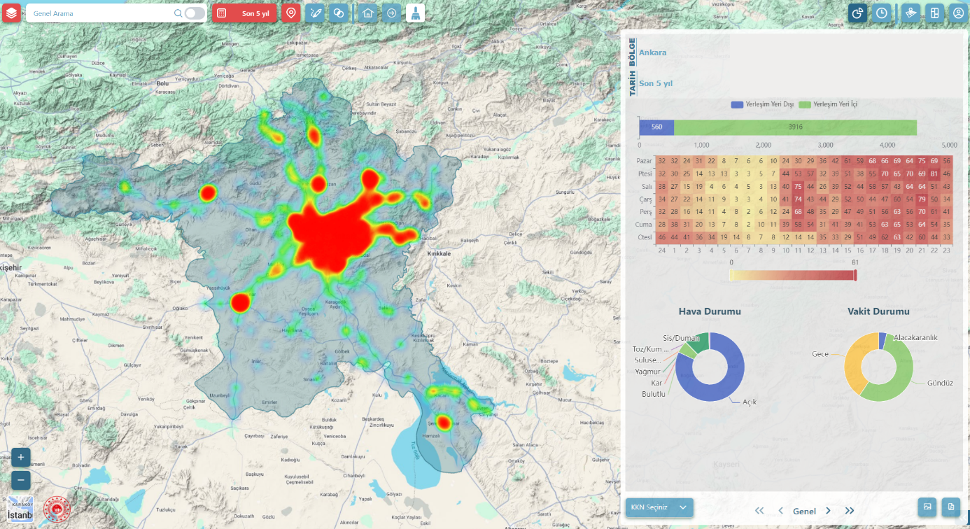 Kaza ve alt mekanizmalarına ait bilgiler kullanılarak kent içi yol ağında trafik güvenliği analizi ve planlaması için karar desteği sağlayan, büyük veriye dayalı web tabanlı bir yazılım platformu geliştirilmiştir. Bu sayede Kaza Kara Noktaları ve Kaza Yoğunluğu Yüksek Bölgelerin coğrafi bilgi sistemleri tabanlı tematik haritalar ile zaman-mekânsal analizi yapılabilmekte ve büyük veri analizi ile koridor ve mikro seviyeyi de içeren esnek bir analiz yapısı sunulmaktadır.